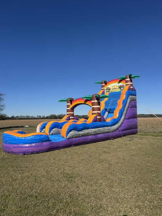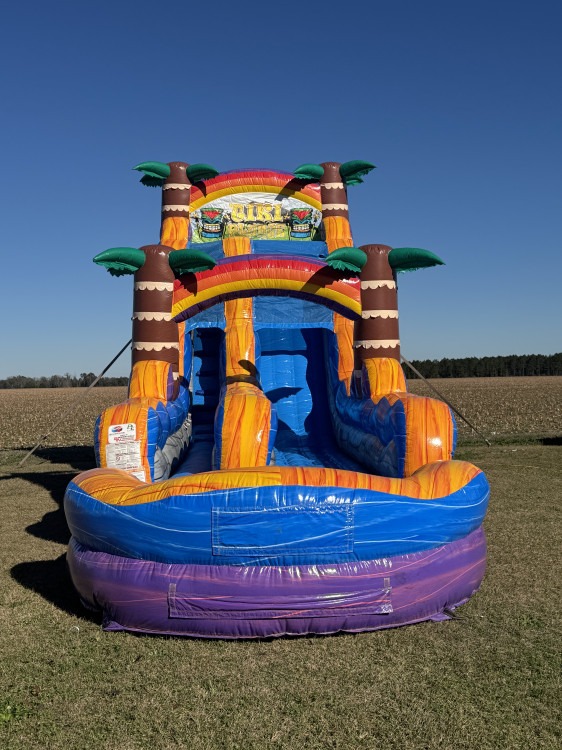 Turn any party into a tropical adventure with our 18ft Tiki Water/Dry Slide! This bright, colorful slide features bold island vibes with palm trees, rainbow arches, and a long extended landing area for extra fun. Perfect for kids, teens, and even adults, it can be used as a refreshing water slide on hot days or as a thrilling dry slide when water isn’t needed.